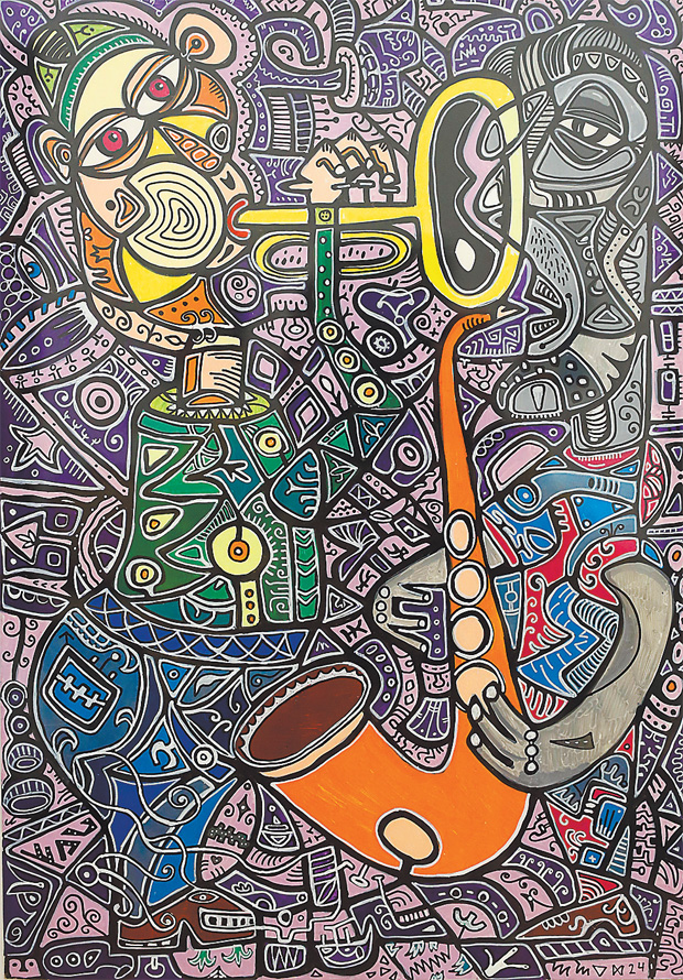 И, к слову, юмор постоянно находит место в его картинах. Например, люди с картин серии «Лица города М.» показаны с необычного ракурса и со странным цветом лица. А в картинах «Джаз» герои и вовсе смешались с музыкальными инструментами, став яркими цветами и инопланетными созданиями.