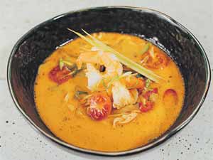 «Варю куриный бульон. При варке добавляю морковку, сельдерей, чёрный и душистый перец, петрушку. Когда готово, процеживаю, курицу откладываю. В бульон по чуть-чуть добавляю тайские ингредиенты: кокосовое молоко, пасту том ям, рыбный соус нам пла, кафрский лайм, лемонграсс, имбирь. Надо всё время пробовать. Если кисло, добавляю чайную ложку тростникового сахара. Если наоборот – выжимаю немного лимона.