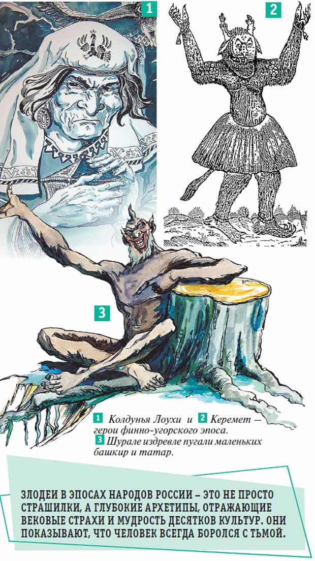 «В тюркской мифологии зло многолико, – говорит Лада Гаевская. – У чувашей есть и Шуйттан, аналог дьявола, насылающий порчу. У алтайцев в эпосе «Маадай-Кара» зло персонифицировано в образе Кер-Гулута, пожирателя людей, который похищает солнце. Герой борется с ним, чтобы восстановить космический порядок».