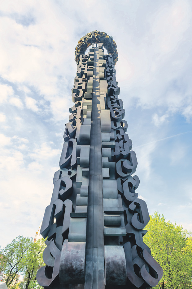 Автор памятника – скульптор Зураб Церетели. Это первая его работа, установленная в Москве. Монумент представляет собой колонну из букв русского и грузинского алфавитов, которые образуют слова «Мир», «Труд», «Единство», «Братство». Венчается колонна виноградной гроздью, переплетённой колосьями пшеницы, где виноград символизирует Грузию, а хлеб – Россию.