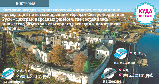 ➊ Ипатьевский монастырь. Мужской монастырь в западной части города на берегу реки Костромы. Царская династия Романовых началась здесь, в монастыре: в 1613 году Михаил Фёдорович Романов был призван на царство.