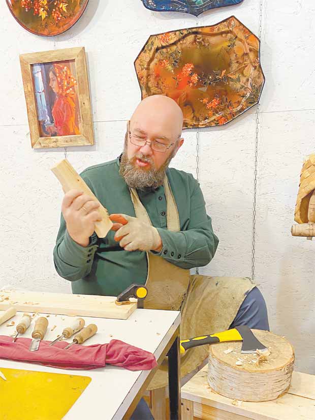«Много лет назад моя бабушка купила дачу в селе Махра Владимирской области, – рассказывает Екатерина. – В детстве и юности я приезжала к ней туда. Потом стали ездить на дачу с мужем. Там очень красивые, древние места, мы колесили по округе с этюдниками, зарисовывали пейзажи». Однажды супруги заехали в городок Юрьев-Польский и увидели местный Георгиевский собор. Весь в каменной резьбе, словно кружевной. Тогда Михаилу впервые захотелось что-то вырезать. А надо отметить, что в этом краю растут вековые липы и берёзы – деревья, традиционно использующиеся резчиками. Тут жители исконно занимались не земледелием, а народными промыслами. Атмосфера до сих пор пропитана этим духом.