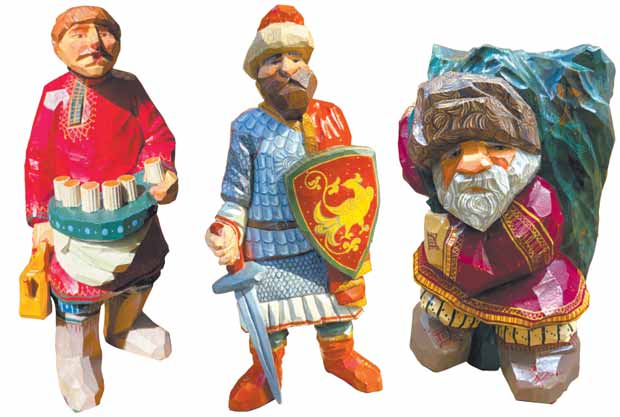 Деревянные меря работы семьи московских художников. Слева направо: Егор, Владимир, дядя Коля-еловик. Фото: личный архив