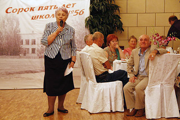 Встреча прошла очень тепло и задушевно. Было много добрых слов, воспоминаний, слез радости и печали. Приехало очень много выпускников разных лет. Некоторые из них окончили школу еще в начале 70-х годов прошлого века, другие гораздо позже. Однако все-таки главная точка отсчета, которую ведут бывшие ученики 56-й, эта дата начала войны. Именно с тех пор осталась в их душе непреходящая тревога за жизнь своих одноклассников и педагогов. И не года и расстояния разделяют сегодня этих людей, а неизвестность. Ведь судьба почти половины учащихся каждого класса довоенного выпуска до сих пор остается невыясненной.