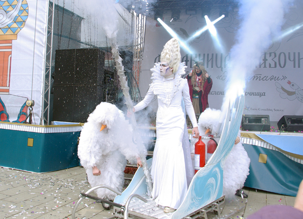 А самое зрелищное и сказочное событие развернулось на главной сцене. К зрителям вышла Снежная королева - олицетворение зимы. Её сопровождали помощники - снеговики и персонажи, похожие на йети. Слуги королевы возили её в санях, пока она пыталась заморозить всех вокруг с помощью ледяного посоха. От него и правда становилось холодно! К счастью, эта история закончилась счастливо - Снежную королеву прогнали до следующей зимы...