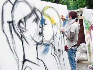 На огромных щитах, расставленных вдоль аллеи, постепенно появлялись изображения героев из известных фильмов, сценок и наиболее известных киноэпизодов - будто их выдували прямо из баллонов с краской! Тема конкурса всякий раз задаётся новая, в этот раз художники в буквальном смысле рисовали кино, снятое известными российскими и советскими кинорежиссёрами различных национальностей.
