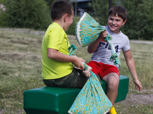 В минувшие выходные жители Южного Бутова устроили настоящий Сабантуй: подушками друг друга побили, на мечах подрались да из лука постреляли. Правда, делали это всё не ради того, чтобы покалечить соперника, а чтобы получить... конфету и услышать восторженные крики взрослых: «Это мой ребёнок такой сильный!»