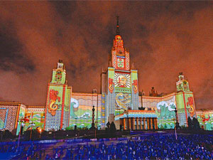 Чем привлекают мультимедийные представления, объединяющие видеопроекции на памятники архитектуры и пиротехнические шоу? В этом году на фасаде Главного здания МГУ были представлены два шоу, которые уже попали в Книгу рекордов Гиннесса в номинациях «Самая большая видеопроекция» и «Самая большая мощность светового потока при проецировании изображения». Их достойным конкурентом стал спектакль, сотканный из света, огня и воды, на Гребном канале в Крылатском.