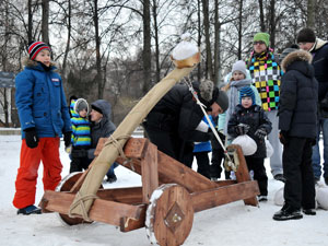 Для каждого выстрела гибкое «плечо» катапульты натягивают с помощью лебёдки, затем снаряд помещают в металлическую чашу и дёргают за верёвку - при этом необходимо молодецки крикнуть «Эх!». Если снега маловато, то вполне годятся мешочки с керамзитом. «Давай, Петя, сильнее дёргай!» - нервничает молодой папа, чей шестилетний сын выступает в качестве стрелка. Играющие делятся на две команды, для начала устраивают краш-тест (чтобы получше пристреляться), и потом начинаются состязания на меткость. А победители (на фото - команда «Урюк») получают памятный кубок - бесформенный кусок снега, но разве в награде дело? Ведь главное - победить в настоящей средневековой битве! Попробуете в следующие выходные?