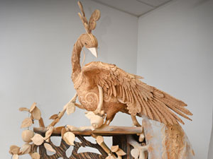 Перед нами птицы, каждое перо которых словно наполнено воздухом, пушистые звери, которых хочется погладить, ювелирной тонкости шкатулки, изящные игрушки... И над всем этим берестяным миром - огромная Жар-птица с роскошным двухметровым хвостом, воздушным и невероятным. Вся экспозиция, собственно, так и называется - «Под крылом Жар-птицы».