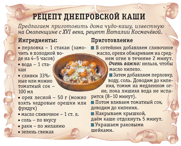 Днепровскую кашу приготовила команда смоленских поваров по рецепту победителя «Русского поля» 2021 г. Наталии Космачёвой — рецепт этого блюда она подбирала долгое время, руководствуясь архивами и устными рассказами старожилов Смоленщины.