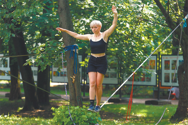На площадке по слэклайну каждый мог попробовать свои силы и пройти по стропе, натянутой между деревьями. Ирина и Алексей из Москвы пришли в парк потренироваться. «Слэклайном я занимаюсь уже около трёх лет. В него меня привели друзья, – поделилась Ирина. – На мой взгляд, слэклайн развивает координацию, чувство контроля над своим телом». Девушка также прыгает с парашютом: «Очень люблю необычные и экстремальные виды спорта. Считаю, что в жизни нужно попробовать всё». Алексей ходит по стропе уже больше 15 лет и даже жонглирует кеглями в процессе. «В этом спорте я оказался почти случайно: увидел, как знакомые им занимаются, а на следующий день рождения получил в подарок стропу, – признался Алексей. – Для меня это почти философия. Когда находишься в гармонии со своим телом, ощущения непередаваемые».