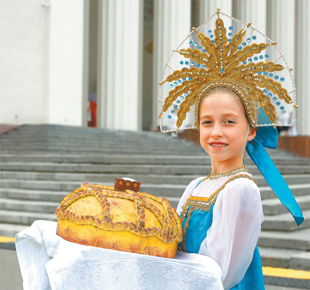Участница народного хореографического ансамбля «Школьные годы» Алиса Грызлова с хлебом-солью. Фото: Игорь Харитонов