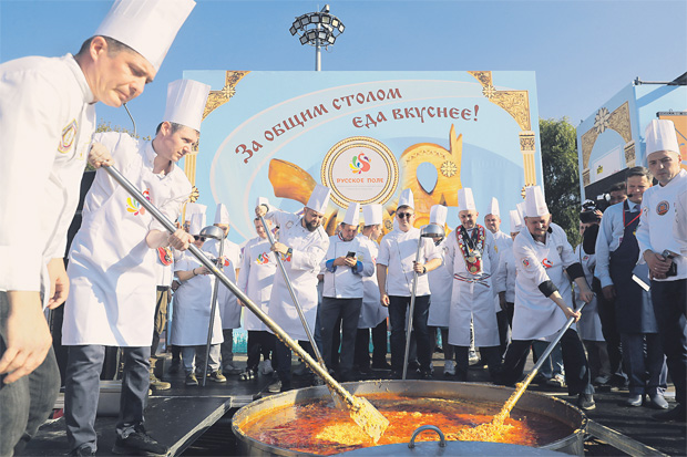 Самым ожидаемым событием стала каша – в этот раз «по-суворовски». Её приготовили и угостили всех желающих. В этом году у полководца три юбилея: в 1799 году состоялся его беспрецедентный переход через Альпы, Екатерина II присвоила ему звание «генералиссимуса». И чуть раньше, в 1784-м, образование Таврической области завершило присоединение Крыма к России, в котором была заслуга легендарного Суворова. «По воспоминаниям участников Альпийского перехода, обоз с провиантом сильно отстал, – рассказала организатор фестиваля «Русское поле» Маргарита Железнова. – Войско на привале накормить было нечем, и предстоящий штурм оказался под угрозой. Тогда у каждого солдата была котомка, в которой он хранил свой неприкосновенный запас. Его-то и приказал Суворов ссыпать в общий котёл. Попали туда ячка, перловка, горох, лук, сухари, сушёное мясо – у кого что было. Всё сварили и разделили». Та самая каша – практически «из топора» – помогла нашей армии преодолеть последний рубеж, выйти в тыл французов и разгромить их.