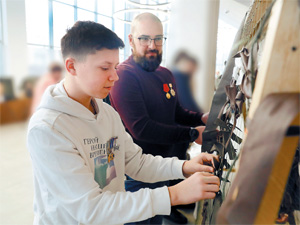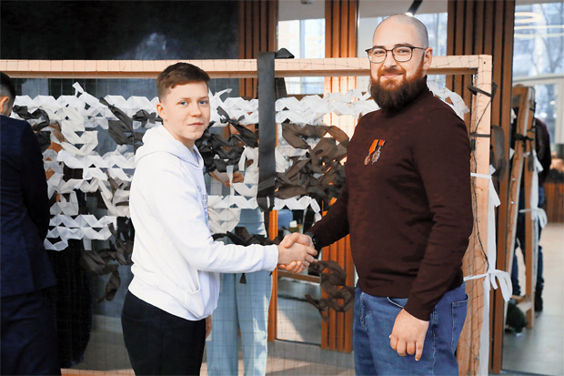 На встрече в вузе Паша Новожилов и врач Камболат Баев попробовали вязать маскировочные сети.