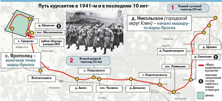 Участники проходят форсированным маршем, маршрут которого пролегает по местам боёв 16-й армии генерала Константина Рокоссовского, в чьём подчинении находился Отдельный курсантский полк в 1941 году. Это настоящая дорога памяти – участники марша посещают более двух десятков братских могил и мемориалов защитникам Москвы. Для того чтобы как можно более достоверно повторить условия, в которых проходил марш-бросок кремлёвцев в 1941 году, сегодня курсанты преодолевают эту дистанцию с макетами оружия Красной армии, которые полностью повторяют вес и габариты вооружения солдат времён Великой Отечественной войны. Финальная точка акции – мемориал кремлёвским курсантам в селе Ярополец. За годы существования акции в ней приняло участие более 9 тысяч человек из 25 городов России и Белоруссии.