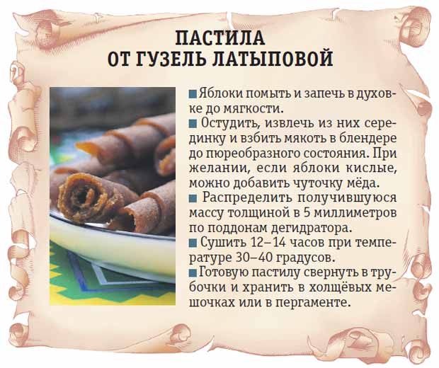 Гузель Латыпова зарегистрировала 100 рецептов пастилы, и это, по её признанию, далеко не предел. В этом лакомстве сохраняются и вкус, и все витамины свежих плодов, а главное, оно может храниться годами, причём без холодильника.