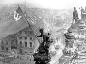Одна из постановочных фотографий Халдея с красным знаменем на крыше Рейхстага
